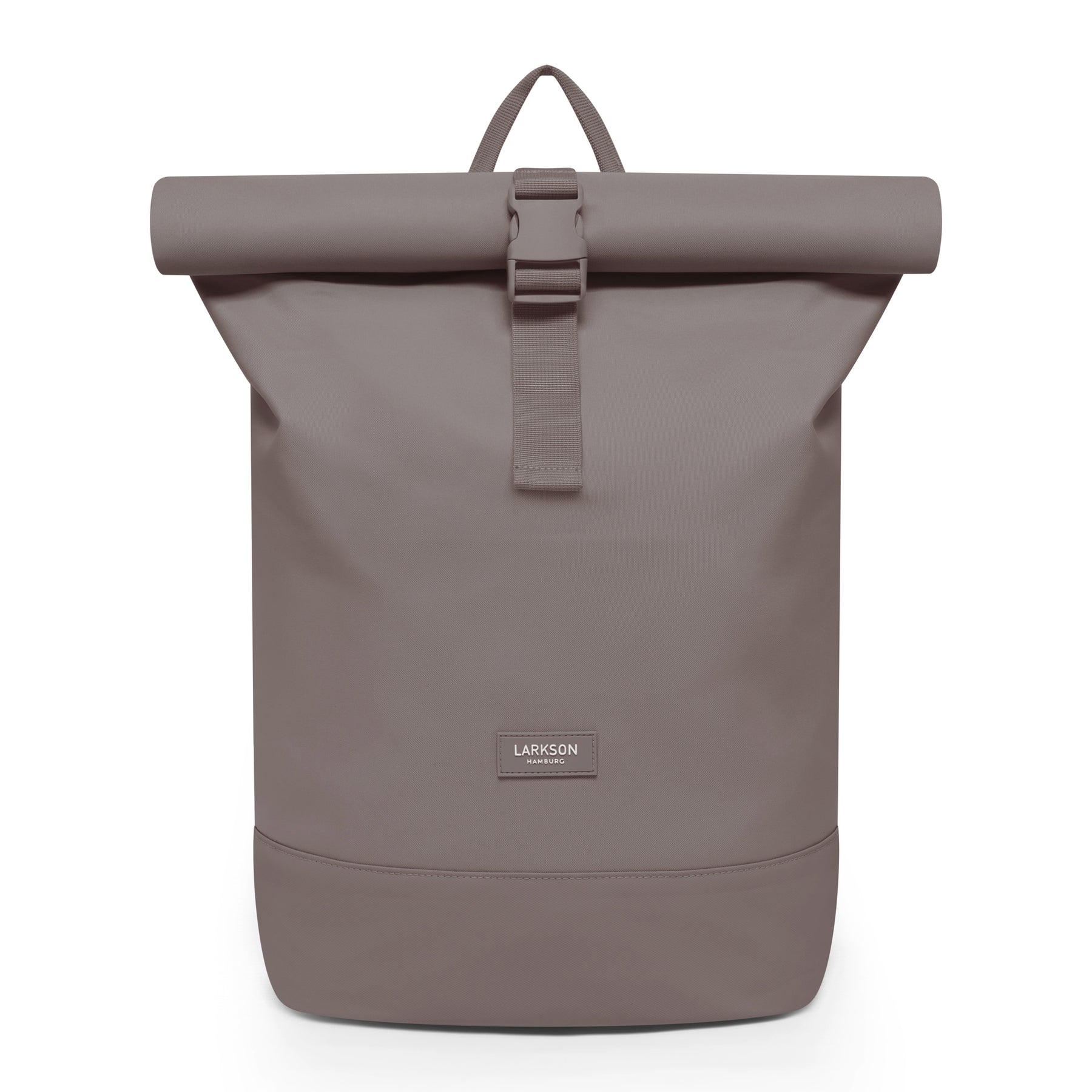 Nahaufnahme des LARKSON Hamburg Logos auf sandgrauem wasserabweisendem Rolltop Rucksack Janne