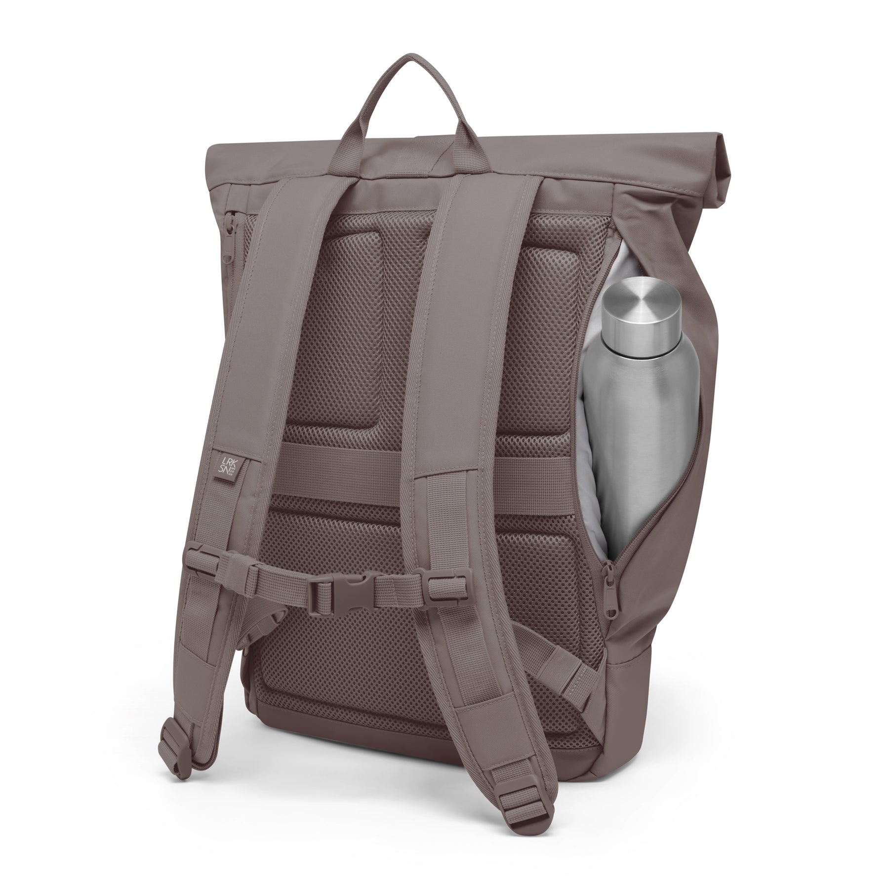 Sandfarbener Rolltop Rucksack Janne von LARKSON mit gepolstertem Rücken und seitlichem Reißverschlussfach mit Edelstahlflasche
