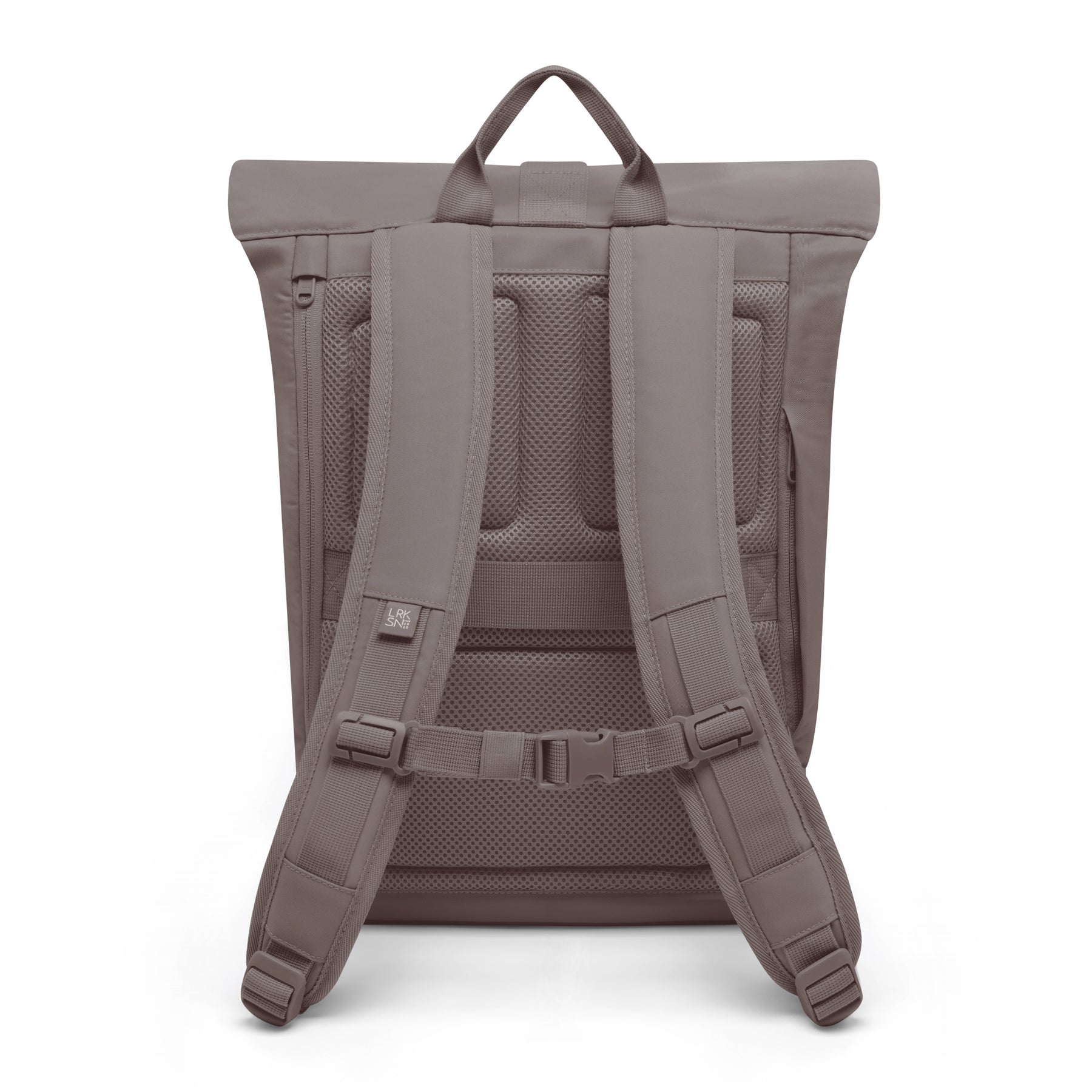 Rolltop Rucksack Janne Small von LARKSON in Sandgrau, Ansicht von hinten mit gepolsterten Trägern und Rückenpolster