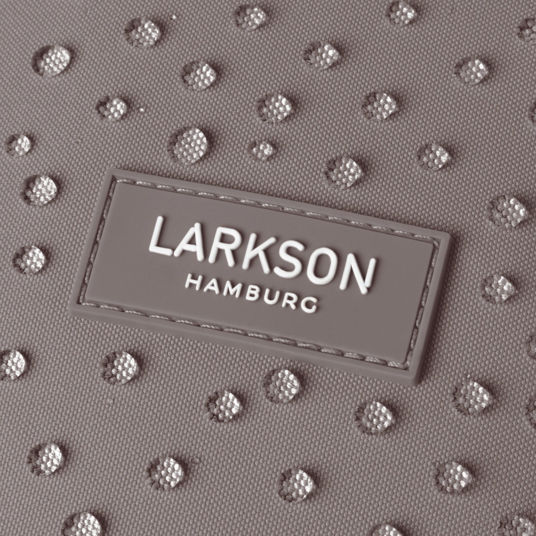 Nahaufnahme des LARKSON Hamburg Logos auf wasserabweisendem Stoff mit Wassertropfen
