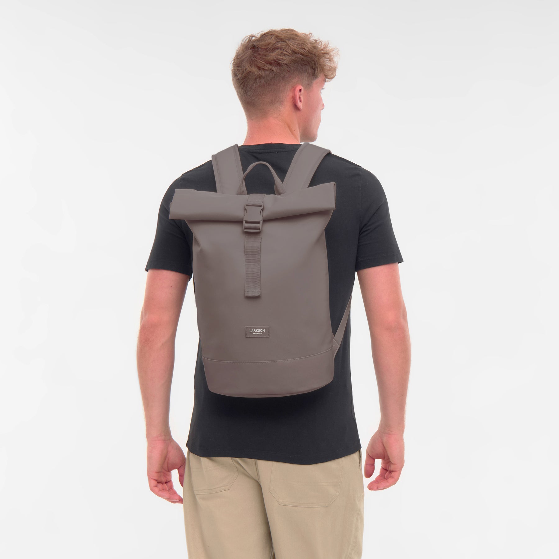 Mann trägt hellbeigen Rolltop Rucksack Janne Small von LARKSON, schwarze T-Shirt, beige Hose