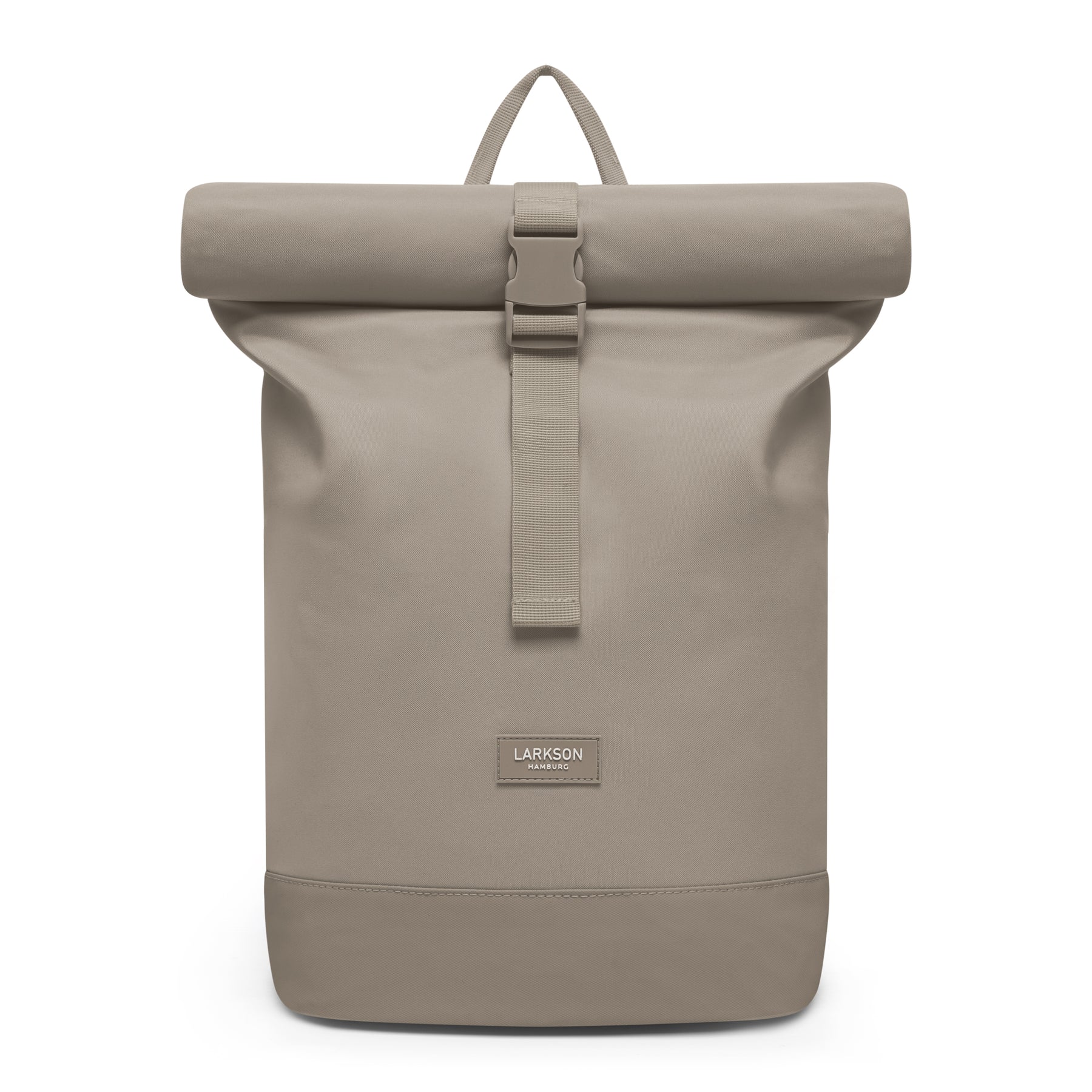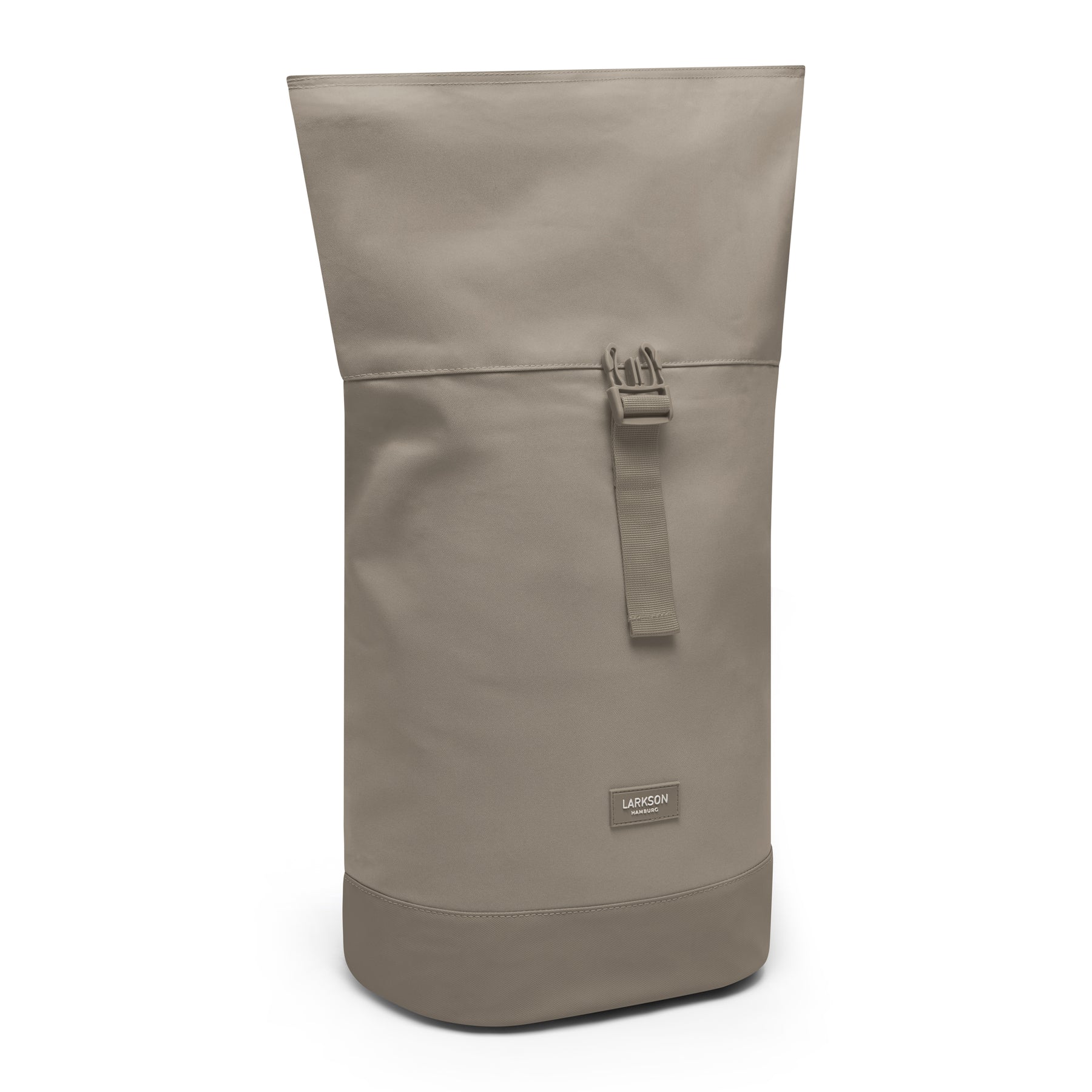 Nahaufnahme eines wasserabweisenden sandgrauen Rolltop-Rucksacks Janne Small mit schwarzem LARKSON Hamburg Logo