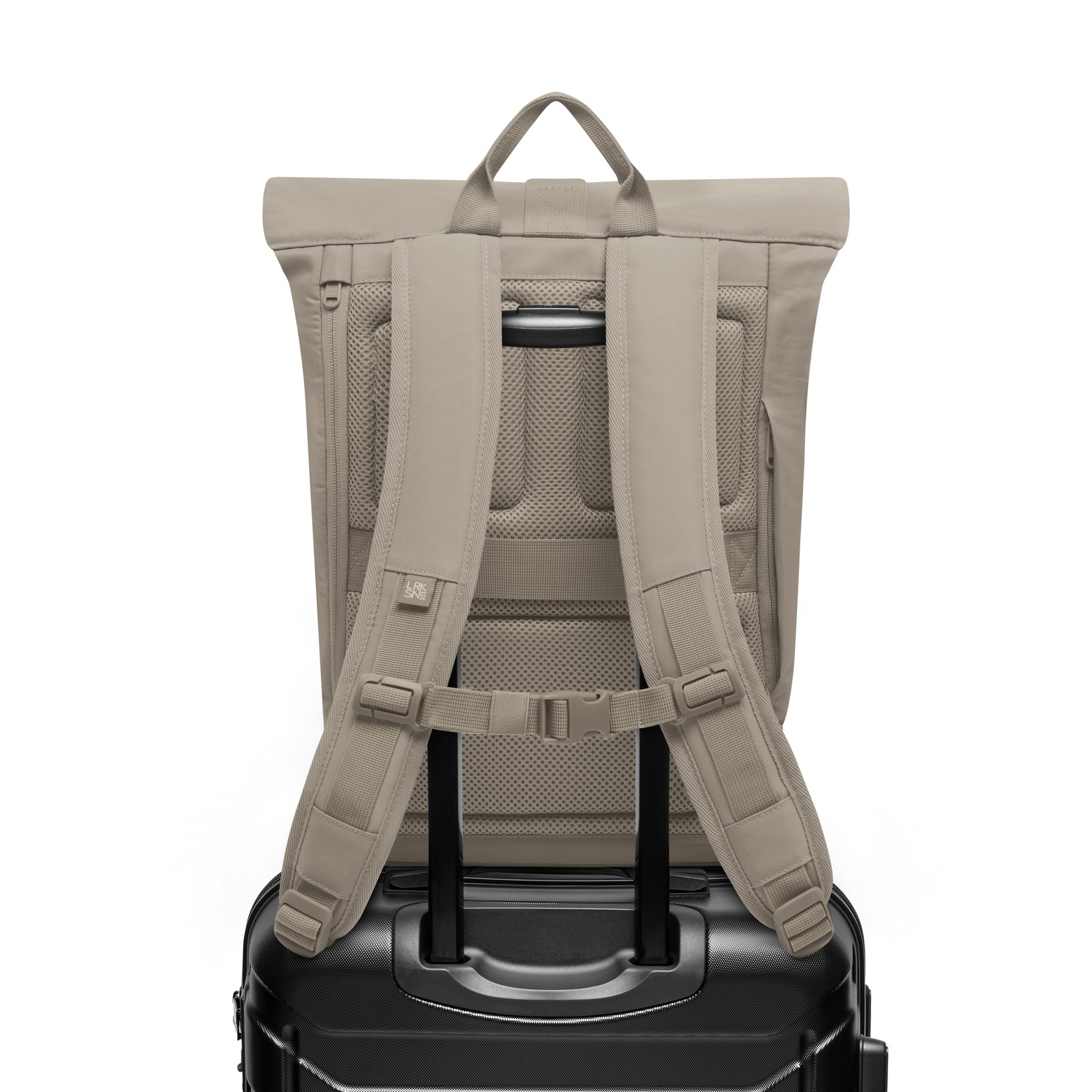 Sandgrauer Rolltop-Rucksack Janne Small von LARKSON auf schwarzem Koffer mit verstellbaren gepolsterten Trägern