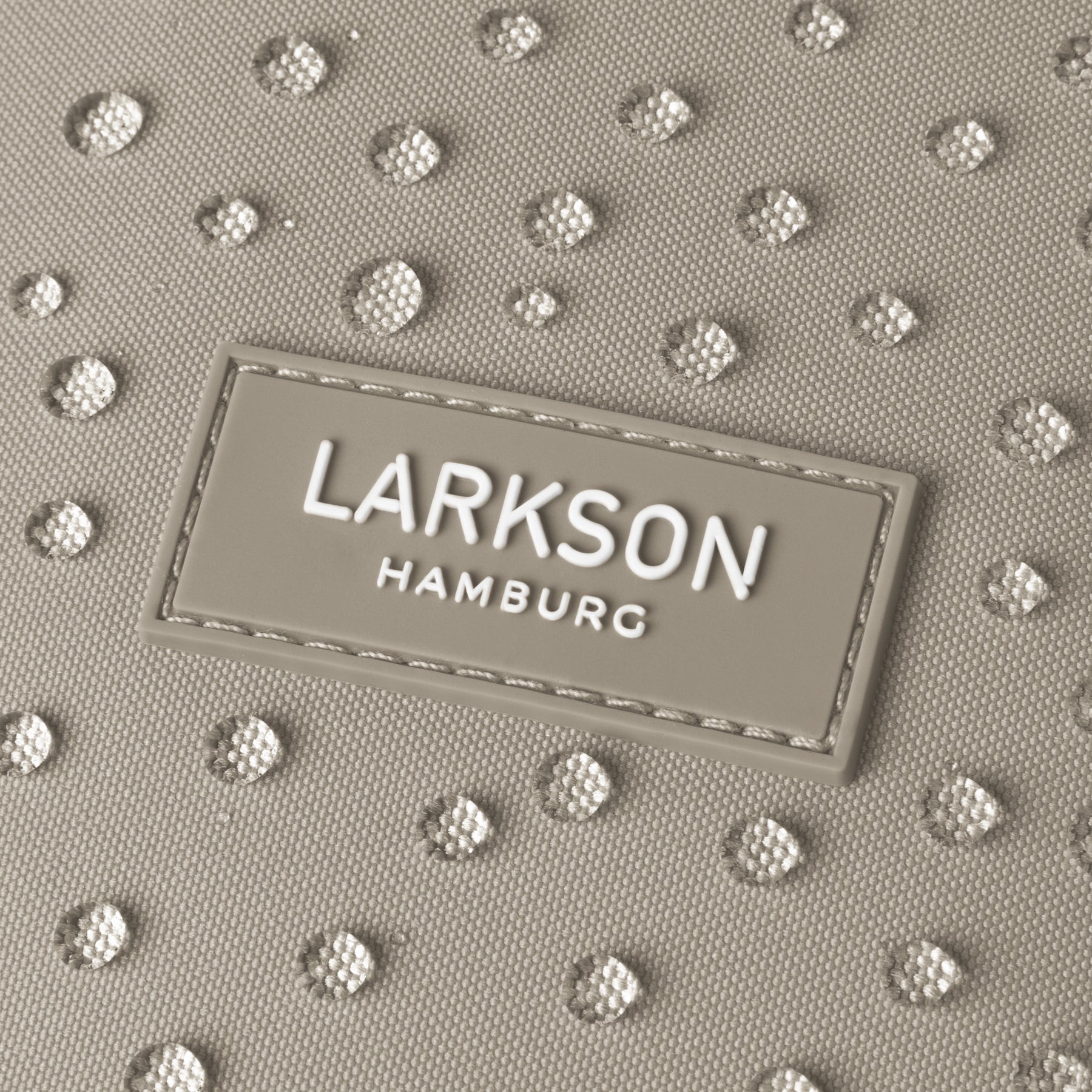 Nahaufnahme des LARKSON Hamburg Logos auf wasserabweisendem Stoff mit Wassertropfen